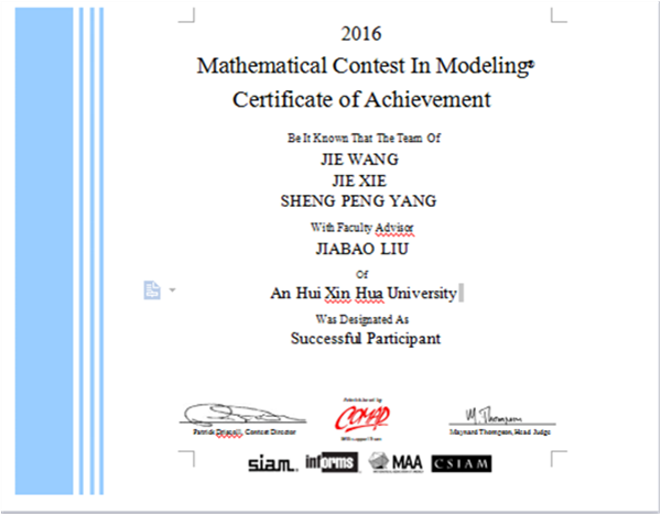 • 安徽新葡萄娱乐场798学院获2016年美国(国际)大学生数学建模竞赛三等奖